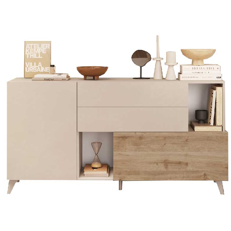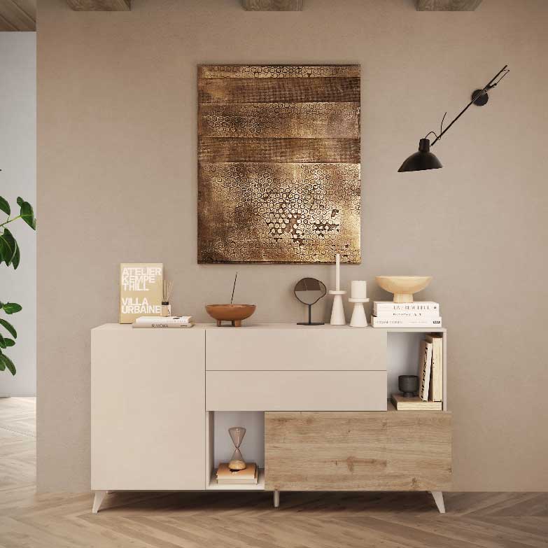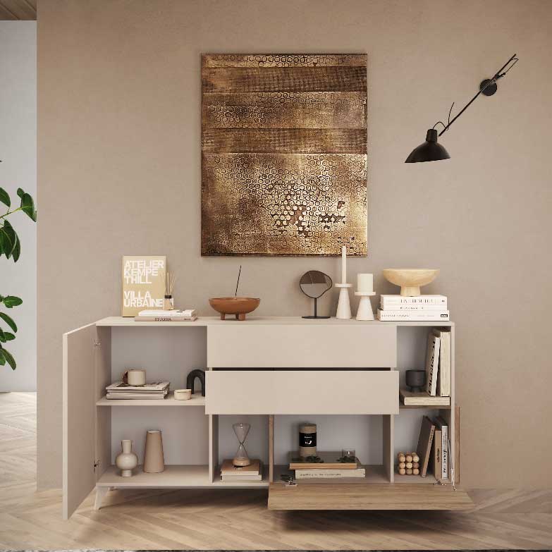 Aparador moderno e versátil, elegante e funcional que combina estilo e praticidade. A porta basculante em Carvalho acrescenta um toque de elegância natural, complementando na perfeição o design moderno. Apresentando dois espaços abertos, este aparador oferece opções versáteis de armazenamento para expor itens decorativos ou armazenar equipamentos, garantindo organização e estilo. Combine-o com a nossa Base TV da mesma linha e irá ficar com uma sala de sonho.