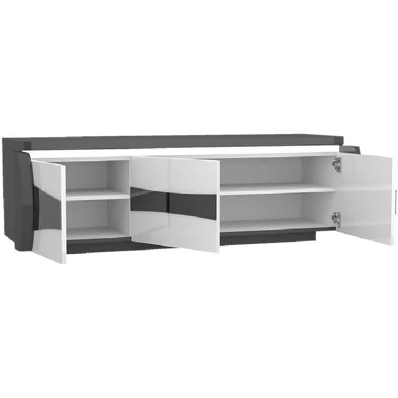 Aparador 3 PortasMagnífico aparador, em cinzento e branco com acabamento brilhante, que reflete a luz da sua sala. O armário está equipado com 3 portas com prateleiras para guardar ordenadamente os seus pertences. A faixa de luz em branco cria um visual muito luxuoso! Complete com os restantes elementos da mesma coleção e ficará com a sua sala de estar e de jantar com design moderno.