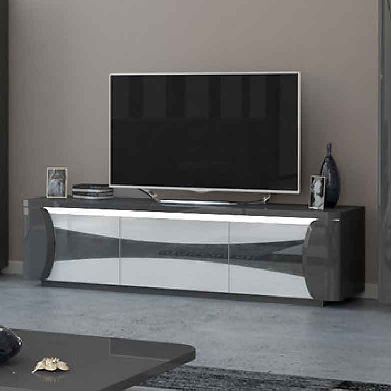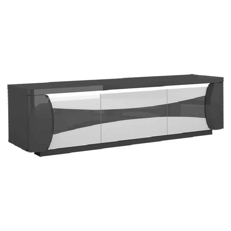 Este móvel de tv combina o requintado alto brilho branco com um acabamento cinzento escuro em alto brilho, o que permite fazer combinações com diferentes estilos. Com 180cm e 3 portas, oferece toda a arrumação necessária para a sua sala de estar.