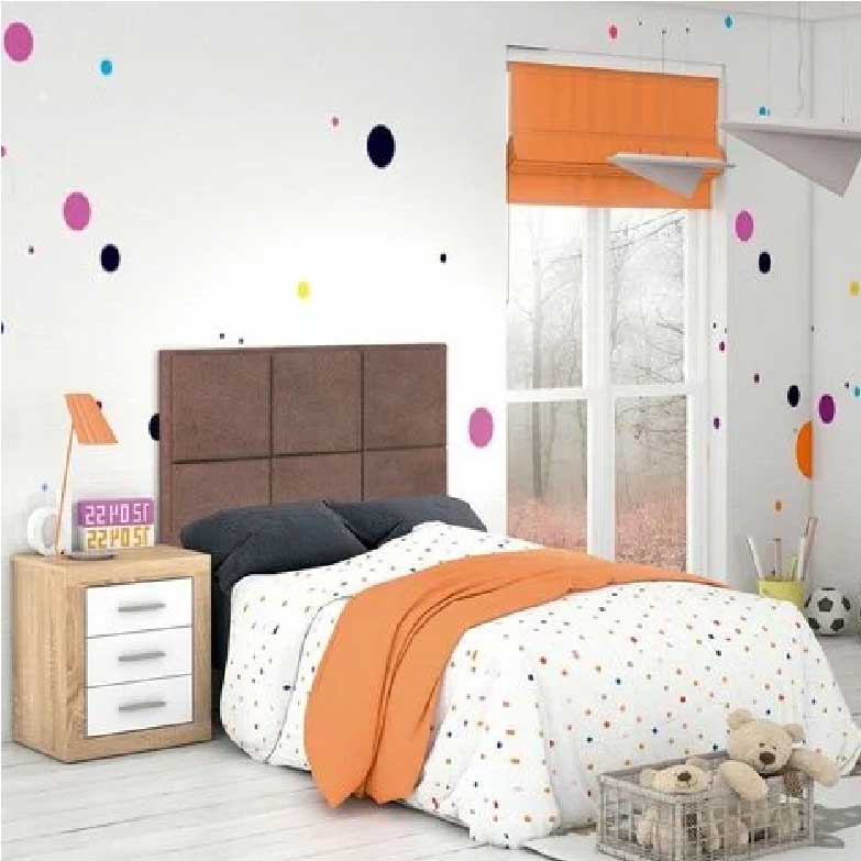 Cabeceira Cama JuvenilCabeceira de cama estofada com detalhes quadriculados e pés metálicos.