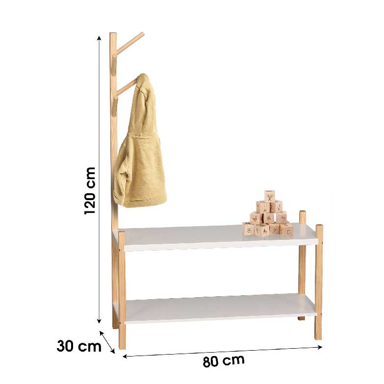 Este cabide com banco está pronto para os sapatos dos seus filhos! Tem duas prateleiras de 80 cm de comprimento nas quais colocar chinelos, botas, ténis e sandálias. O bengaleiro de madeira maciça, para que possam pendurar os casacos à altura deles para que possam alcançá-los com autonomia. O bengaleiro pode ser colocado do lado esquerdo ou direito, como for mais conveniente. Esta peça de mobiliário é feita de pinho branco e natural, e encaixará em qualquer decoração graças ao seu estilo puro.