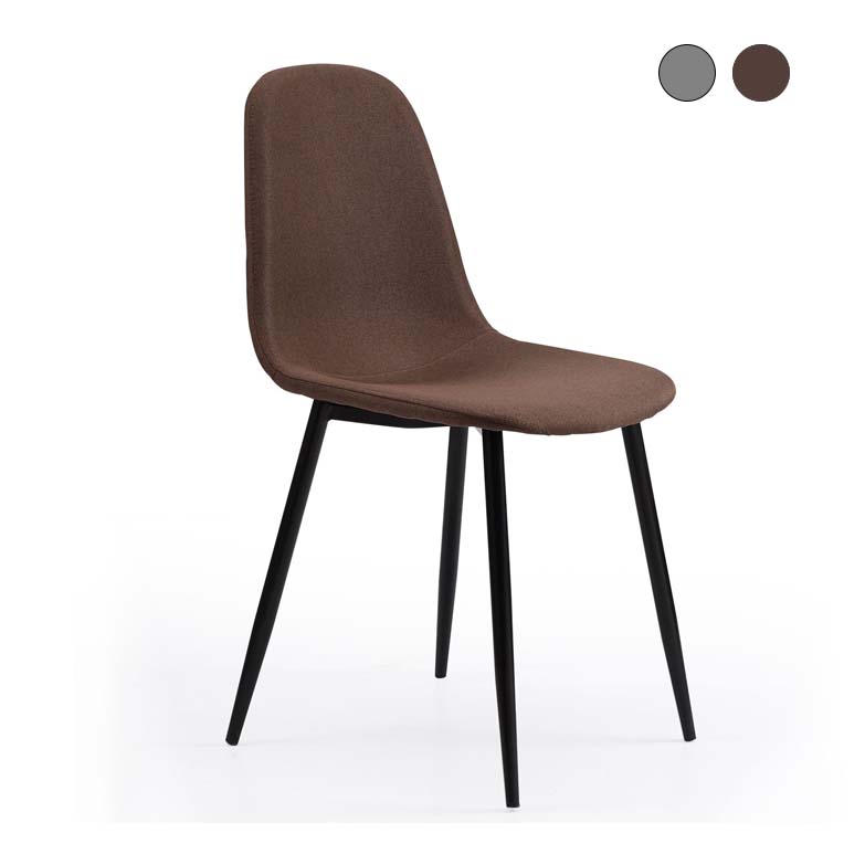 Esta cadeira de jantar tem um design minimalista vintage que a torna perfeitamente adequada a qualquer decoração. Possui estofamento em tecido na tonalidade cinzento ou chocolate, e pés metálicos muito resistentes na cor preta. O conforto que oferece é enorme, e tanto o encosto quanto o assento são acolchoados.