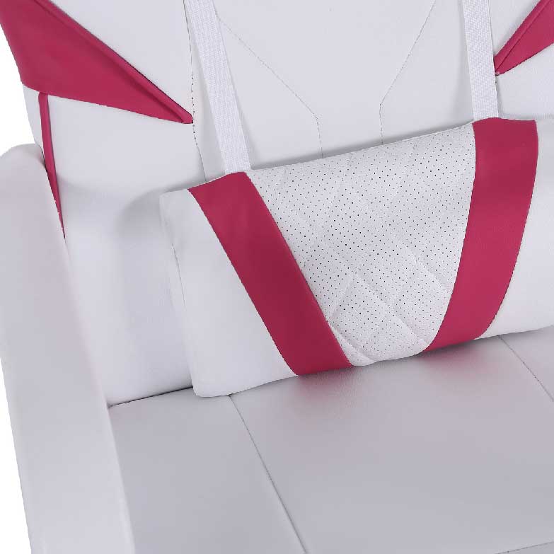 Esta cadeira Gamer, composta por um assento estofado em tecido eco – couro combina as cores branco e rosa e uma estrutura com rodas com acabamento em branco . Possui altura regulável , apoio de braços e almofada lombar ajustável . O design desta cadeira consiste num bordado decorativo na parte superior do encosto.