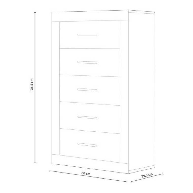 Camiseiro com 5 gavetas discretas e puxadores horizontais e frontais que contrastam com o restante do móvel. Este camiseiro adapta-se a diferentes estilos: quartos de adultos, quartos de crianças ou quartos de jovens . É um móvel resistente , robusto e higiénico graças ao facto de ser fabricado em melamina de elevada qualidade