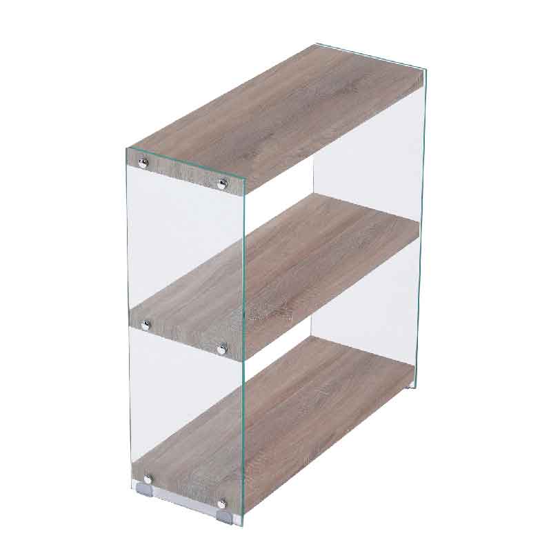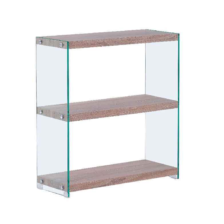 Estante simples e moderna com prateleiras em Carvalho e com as laterais em vidro temperado, irá trazer o design à sua sala ou escritório.