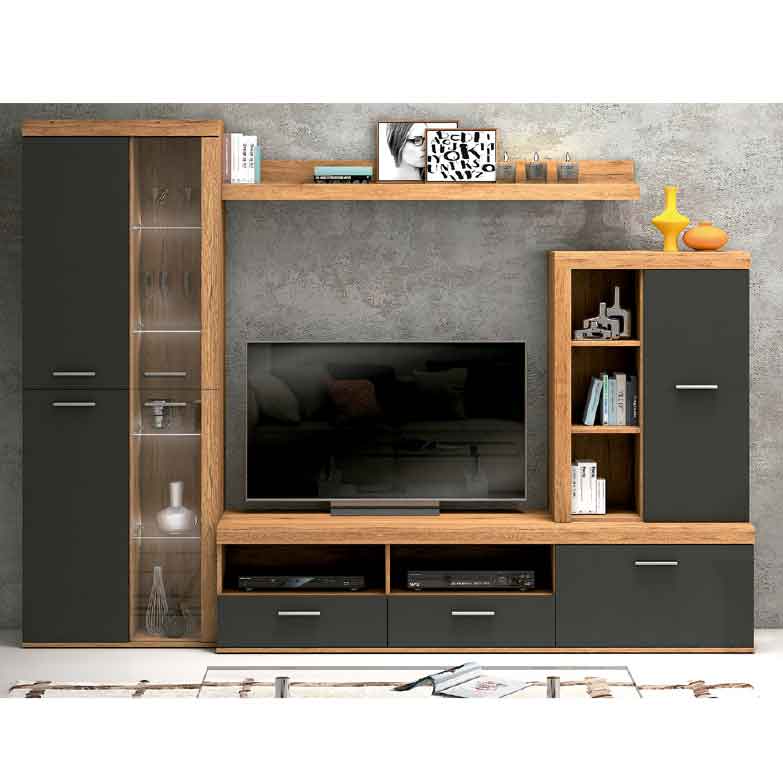 Composição da sala de estar de 260 cm. de largura. Composto por base tv com portas, uma estante, uma prateleira e uma vitrine com prateleiras, portas e iluminação lead. É um modelo único que irá ficar muito bem na sua sala.