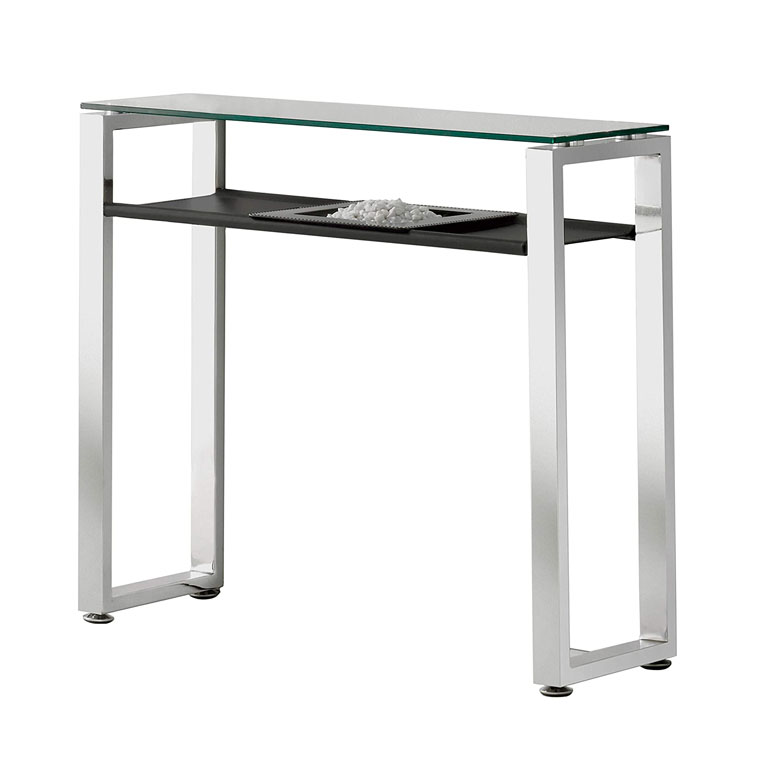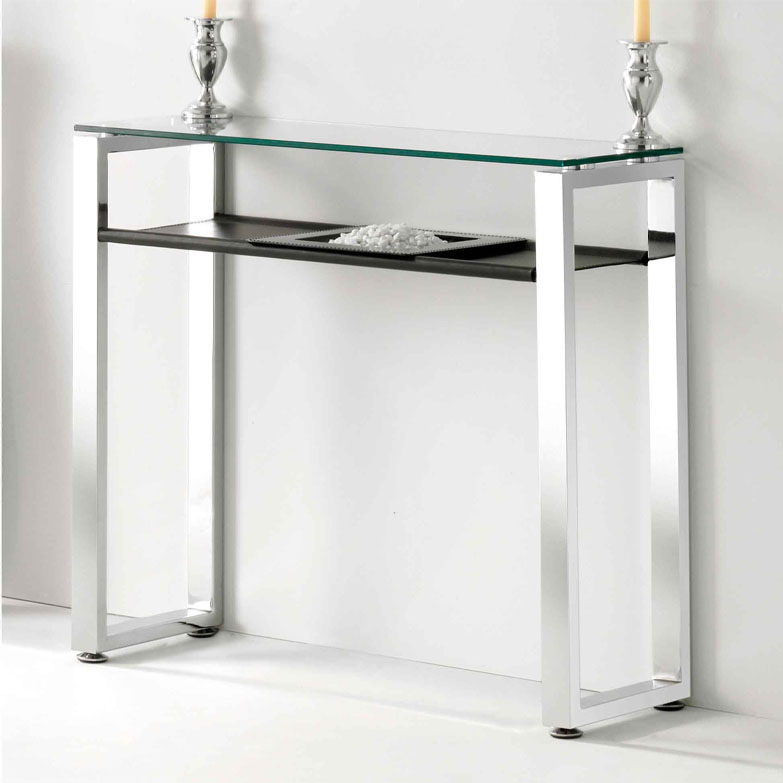 Espectacular hall de entrada de vidro que oferece grandes estabilidade graças ao seu desenho. Este elegante hall é composto por uma consola com pés de aço com acabamento em vidro e uma prateleira forrada a couro sintético preto, um móvel de estilo muito sóbrio e minimalista. Um hall que fará da entrada da sua casa um design exclusivo!