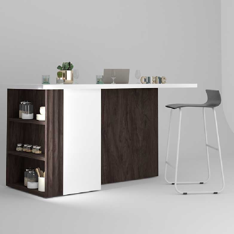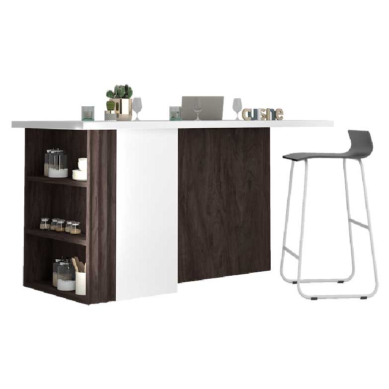 – Prática ilha de cozinha ou zona de refeições de 180 cm em aglomerado resistente de 18, 22, 25, 28 mm em wengué castanho escuro com tampo em lacado branco brilhante.