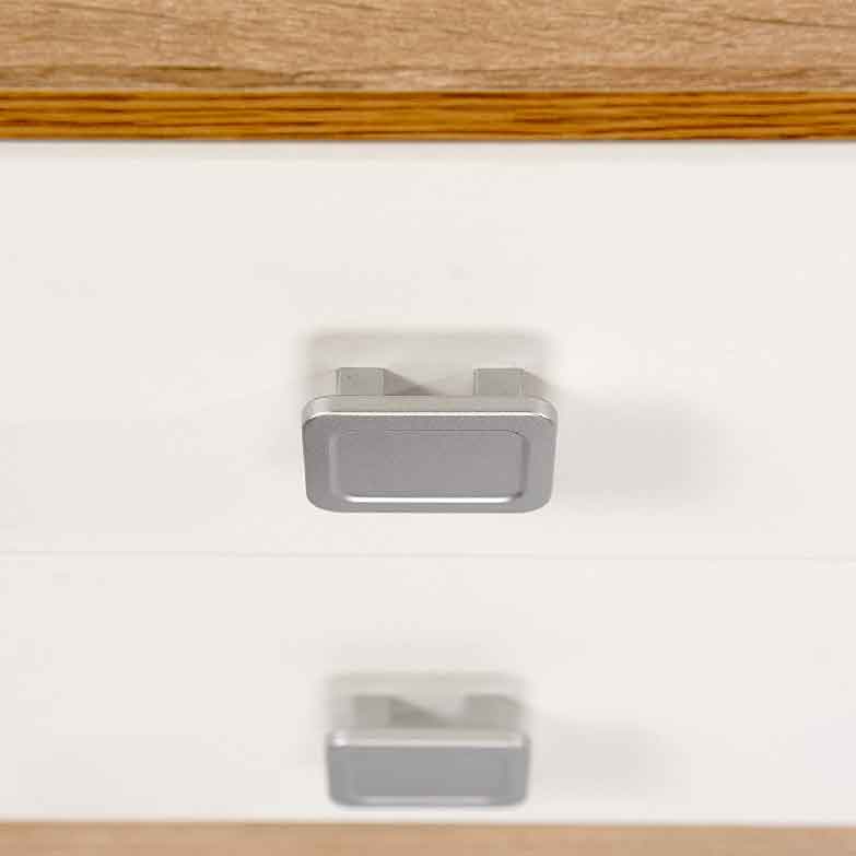 Cómoda 3 gavetasEsta cómoda de cor branco pérola pode ser personalizada com detalhe em rosa ou azul, proporcionando uma aparência quente e moderna ao quarto dos mais pequenos.