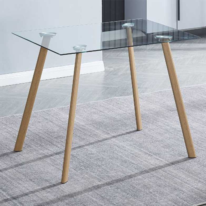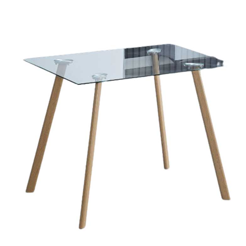 Esta mesa de cozinha fixa destaca-se pela combinação perfeita entre o tampo de vidro e os pés em madeira. Combina perfeitamente com diferentes cadeiras.