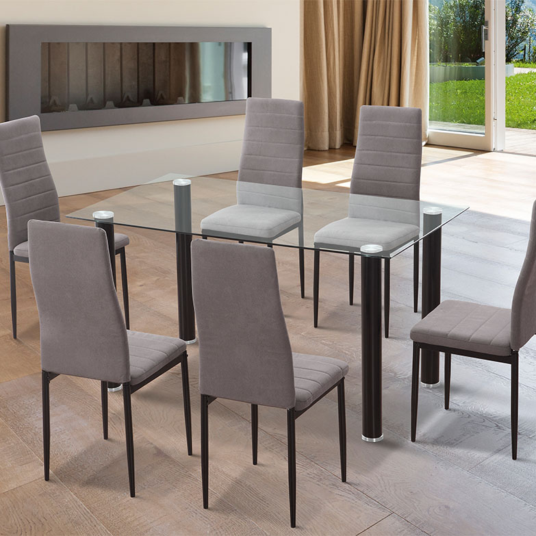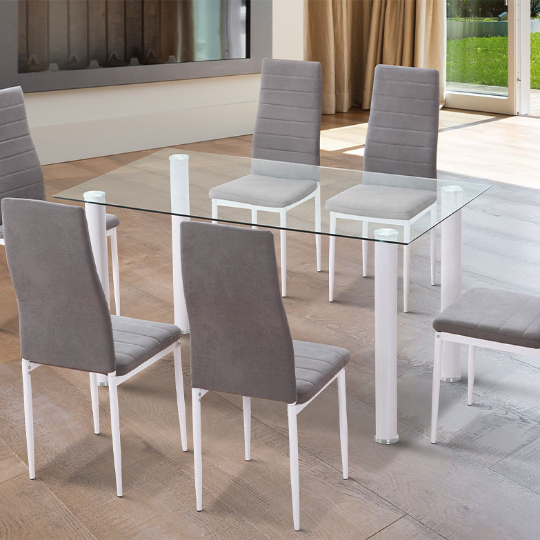 Simples e barato, mas de qualidade mais do que adequada. O vidro temperado garante resistência e as pernas de metal em tubo de aço, a estabilidade. O vidro é transparente e as pernas são pintadas de preto/branco. Adquira as cadeiras a condizer pelo conjunto ideal a um preço único, em branco ou preto.