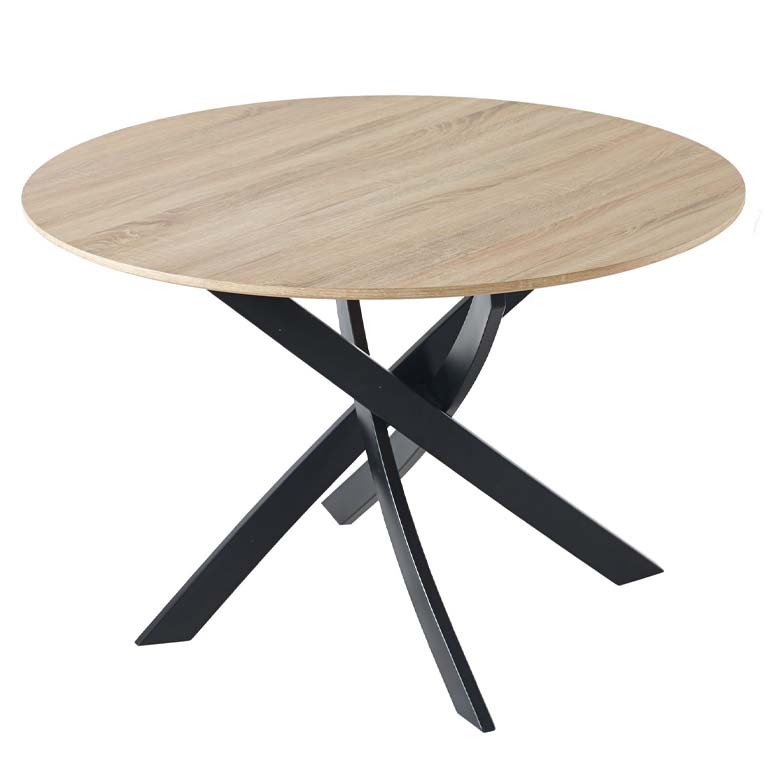 Esta mesa de jantar redonda tem estrutura metálica preta formada por pernas cruzadas muito estáveis, design que confere presença e volume ao móvel. O tampo em MDF com tampo em papel laminado que reproduz o grão natural da madeira confere-lhe um aspecto de madeira natural.