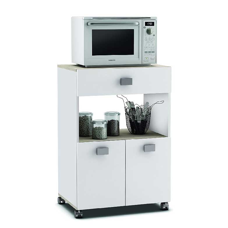 Elegante e moderno móvel de cozinha baixa em prateleiras brancas e de carvalho. Com 4 rodas para que que possa movê-lo confortavelmente. Este móvel com capacidade de armazenamento para a sua de cozinha, espaço nas prateleiras para colocar utensílios, microondas ou o que precisar e ainda com 2 portas e uma gaveta com guias de metal, para colocar, por exemplo, os talheres, e outros utensílios da sua cozinha..