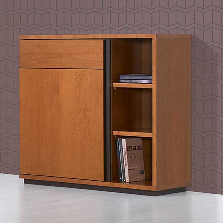 Móvel de Hall com 1 porta de bater, 1 gaveta e prateleiras oferecendo bastante espaço de arrumação. A combinação de cores Pinho Mel e Wenguê apresenta um design intemporal.