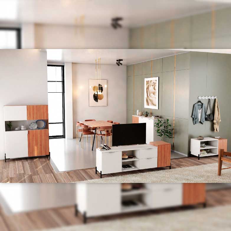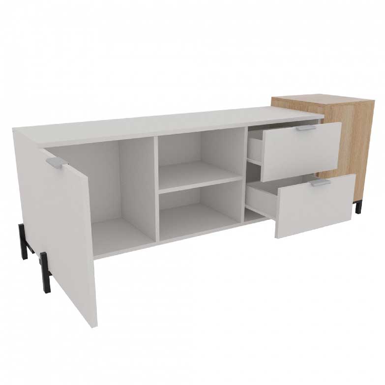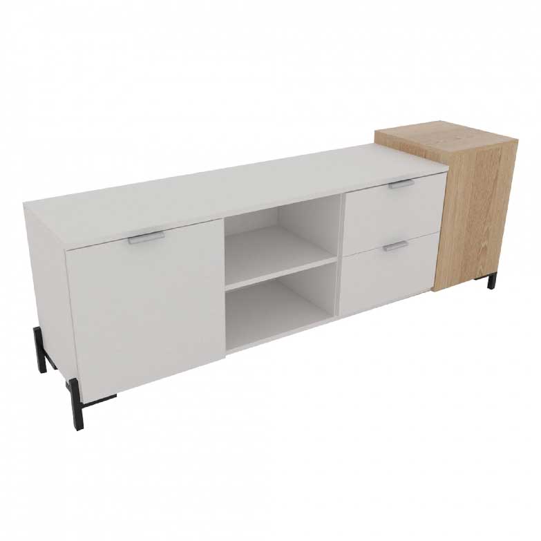 Móvel tv com design moderno com destaque no detalhe. Estética minimalista, com bastantes zonas de arrumação. Esta base TV combinada com o aparador e a mesa de centro irá trazer luz, harmonia a sua sala de estar.