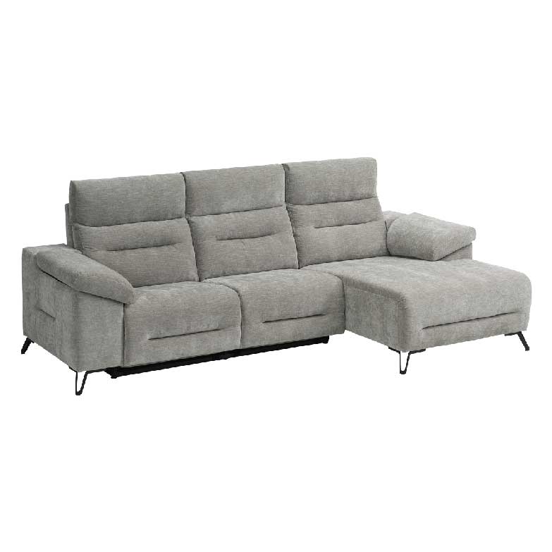 Com um design atraente e moderno este sofá de 3 lugares com chaise longue é a escolha acertada para a sua nova decoração. Modelo bastante confortável disponível com 2 mecanismos relax elétricos. Ambos os braços possuem baú para arrumar os seus gadgets. Revestimento em tecido e pés de metal.