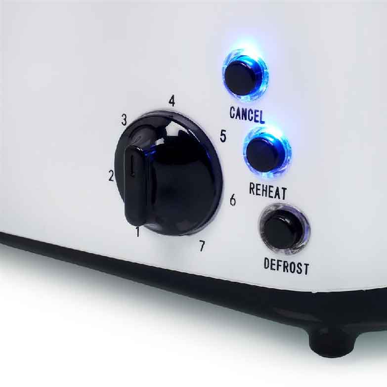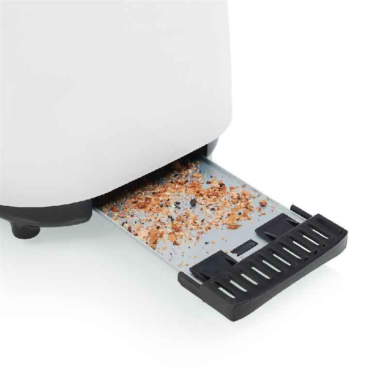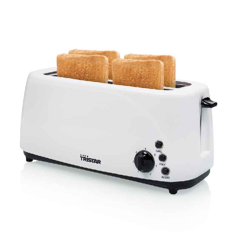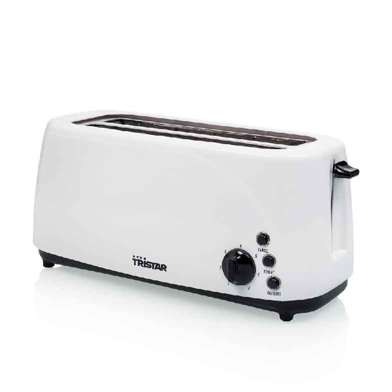 Prática torradeira de plástico com 2 ranhuras compridas para 4 fatias de pão. Equipado com tabuleiro para migalhas amovível e termóstato com 7 posições. Fornecido com função de cancelar, reaquecer e descongelar.